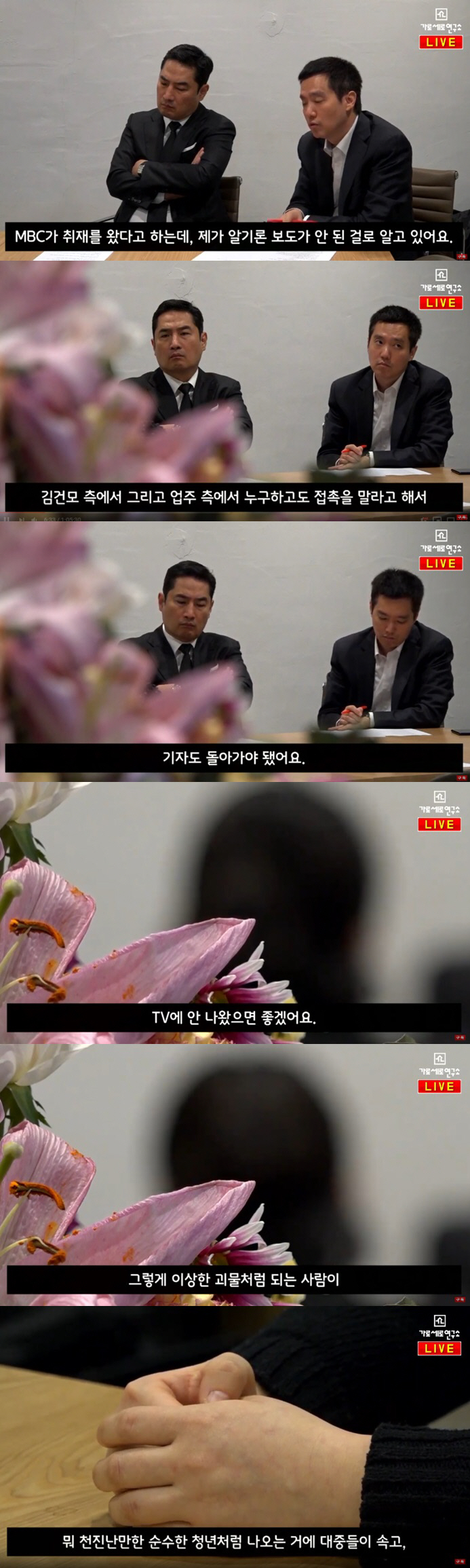 마지막으로 B씨는 '김건모한테 바라는 점'을 묻는 질문에 "TV에 안 나왔으면 좋겠다. 술먹고 이상한 괴물처럼 되는 사람이 시청자 앞에서는 그 모습을 숨기고 천진난만한 순수한 청년처럼 나오는 것에 대중들이 속는게 화가 난다"며 "돈을 바라지 않는다. 그 피해 여성분에게 힘을 실어주고 싶었다"고 호소했다.