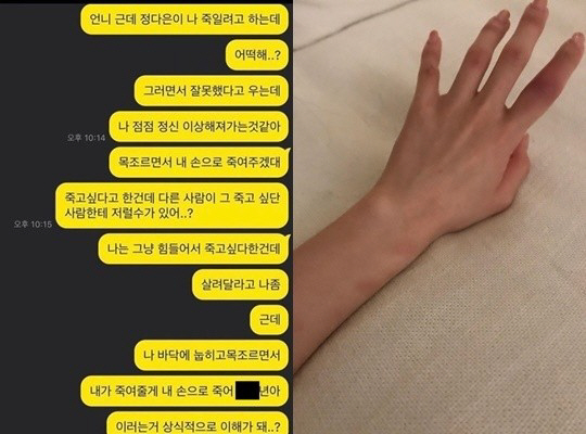 한서희는 12일 자신의 SNS에 지인에게 보낸 카카오톡 대화 내용을 공개했다. 공개된 대화내용에서 한서희는 "언니 정다은이 나 죽이려고 하는데 어떡해? 잘못했다고 우는데 나 점점 정신 이상해져가는 것 같아. 나는 그냥 힘들어서 나름 살려달라고 죽고싶다고 한건데 그런 사람한테 목 조르면서 내 손으로 죽여주겠다는 게 상식적으로 이해가 되냐"고 토로했다.