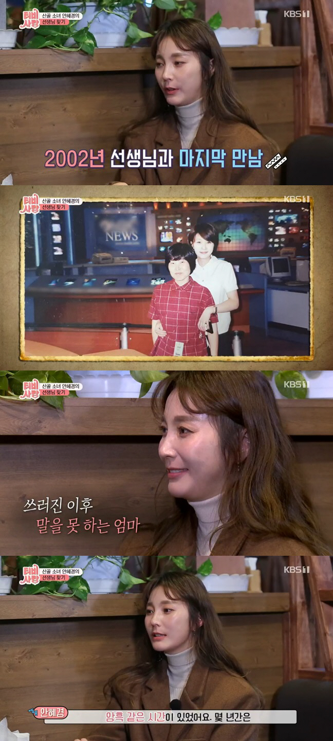 안혜경의 어머니는 뇌경색으로 쓰러지며 뇌의 많은 부분이 손상됐다고. 안혜경은 당시 어머니가 쓰러졌던 날짜까지 정확히 기억하며 "옛날만큼 기억력이 좋지 않고, 말을 잘 할 수 없게 된 어머니와 수다를 떨지 못하는 것이 세상에서 제일 슬픈 일이다"라며 눈시울을 붉혔다. 이어 안혜경은 "밑바닥까지 떨어졌었다. 뭘 하려고 해도 다 안 되는 암흑 같은 시간이었다"며 당시를 회상했다. 지옥 같은 시간을 보내며 선생님을 찾아뵐 여력 없이 17년을 흘려보냈다며 죄송한 마음을 내비쳤다.