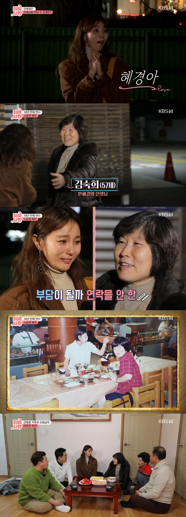 이후 안혜경은 현재 부모님이 살고 계시는 고향집으로 선생님을 모시고 가 정성스럽게 식사 대접을 했다. 선생님은 "오늘 안혜경과 부모님을 오랜만에 만나 너무 행복하다"면서 뿌듯한 마음을 드러냈다.