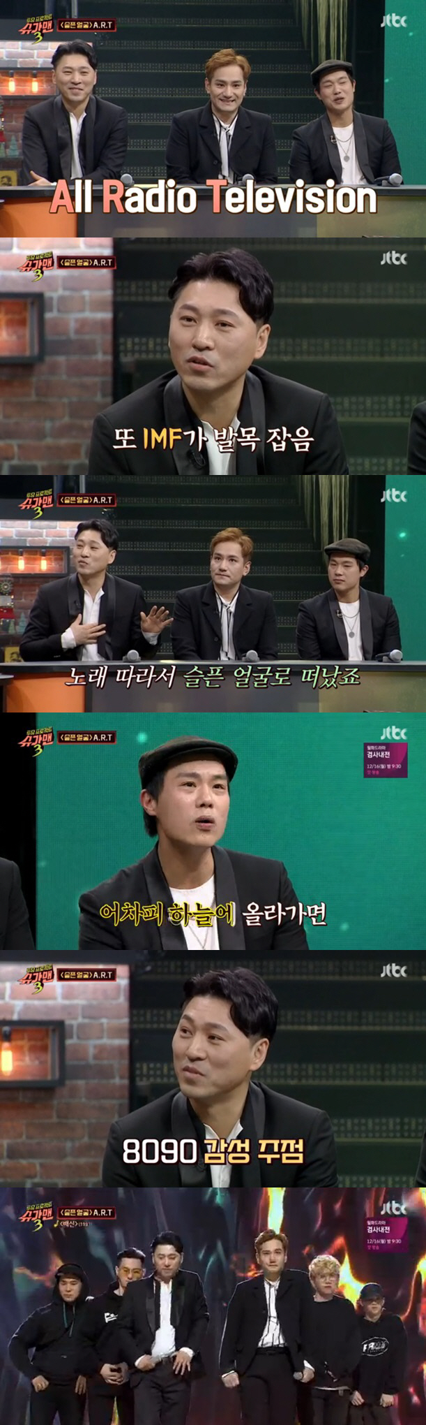 이어 A.R.T가 '슈가맨'으로 등장했고, 대표 발라드곡 '슬픈 얼굴'을 열창했다. 애절한 보이스에 파워풀한 랩, 그리고 고난이도의 안무까지 완벽하게 소화해 모두의 환호를 자아냈다. 무대를 마친 A.R.T는 "18년만에 무대에 섰다. 저희는 활동 당시 항상 라이브 무대를 고집했었는데, 오늘 무대 역시 라이브로 선보여드렸다"고 소감을 전했다.