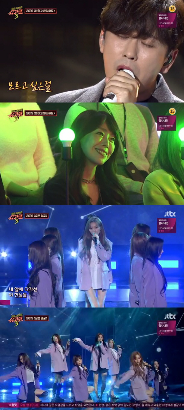 13일 방송된 JTBC '투유프로젝트-슈가맨3'에는 '슈가맨'으로 소환된 가운데 '쇼맨'으로는 밴드 데이브레이크와 러블리즈가 출연했다.