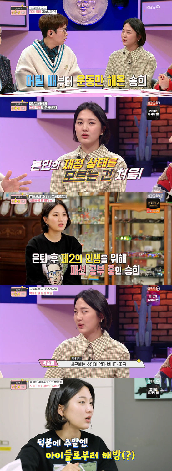 16살 때부터 13년간 연금을 받아왔으나 단 한 번도 금액에 대해 알아보지 않았다는 박승희는 현재 제2의 인생을 준비하고 있다. 하지만 현재 용돈을 받아 쓰고 있는 박승희는 매월 연금으로 100만 원을 받고 있지만, 한 달 용돈은 그 이상인 150만 원 이라고 밝혀 모두를 놀라게 만들었다.