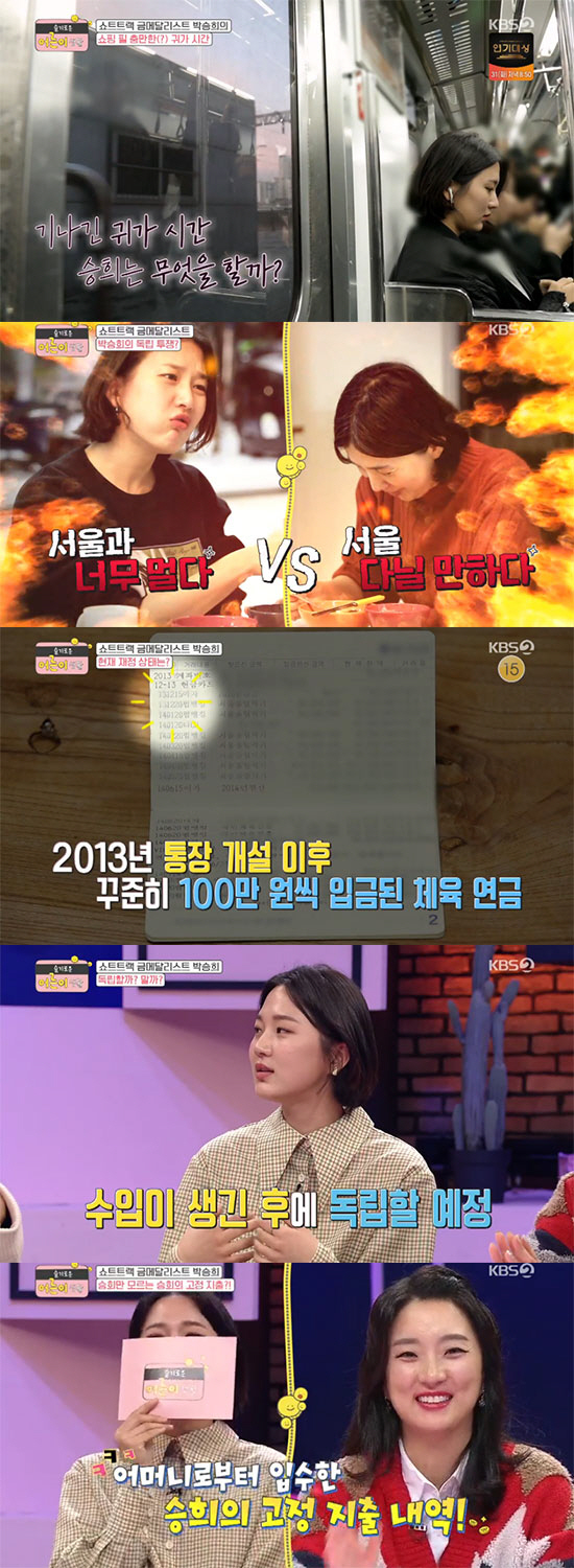 독립을 꿈꾸는 박승희와 이에 반대하는 어머니는 상반된 의견을 보이며 열띤 논쟁을 펼쳤다. 어머니는 박승희에게 독립할 때 필요한 월세, 관리비 등 뼈 때리는 '팩트폭력'을 했다. 이어 딸을 위해 보험, 적금, 용돈 통장 등을 준비한 사실을 밝히며 직접 통장을 보여줬다. "내 통장을 처음본다"는 박승희는 어머니가 철저하게 준비해둔 통장을 보며 흐뭇하게 웃었다. 어머니는 "작은 돈부터 잘 관리해보는게 좋겠다"고 조언했다.