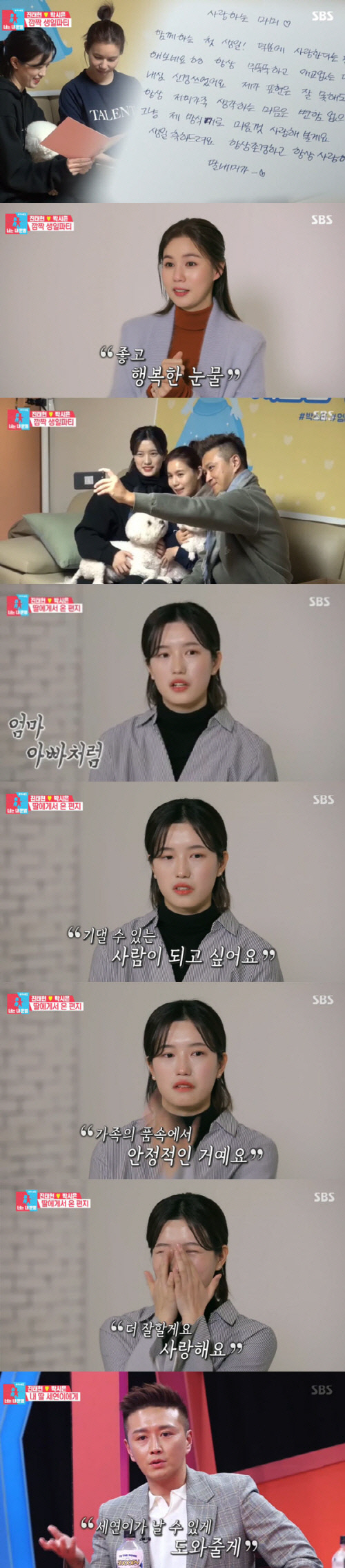 이어진 세연 양이 진태현, 박시은 몰래 준비한 영상 편지가 공개됐다. 세연이는 "어머니 아버지, 두 분 보면서 많이 배우고 닮고 싶다"면서 "두 분처럼 도움이 필요한 사람에게 도움을 줄 수 있는 그런 사람이 되고 싶다"며 그동안 하지 못했던 이야기를 했다. 이어 "가장 많이 하는 말이 '내 삶이 어떻게 흘러가는 지 모르겠다'인데, 그 안에서 안정적이다. 두 분 믿고 흘러가는대로 따라갈 수 있듯이 의미가 크다. 앞으로 제가 잘하겠다"라며 눈물을 흘렸다.