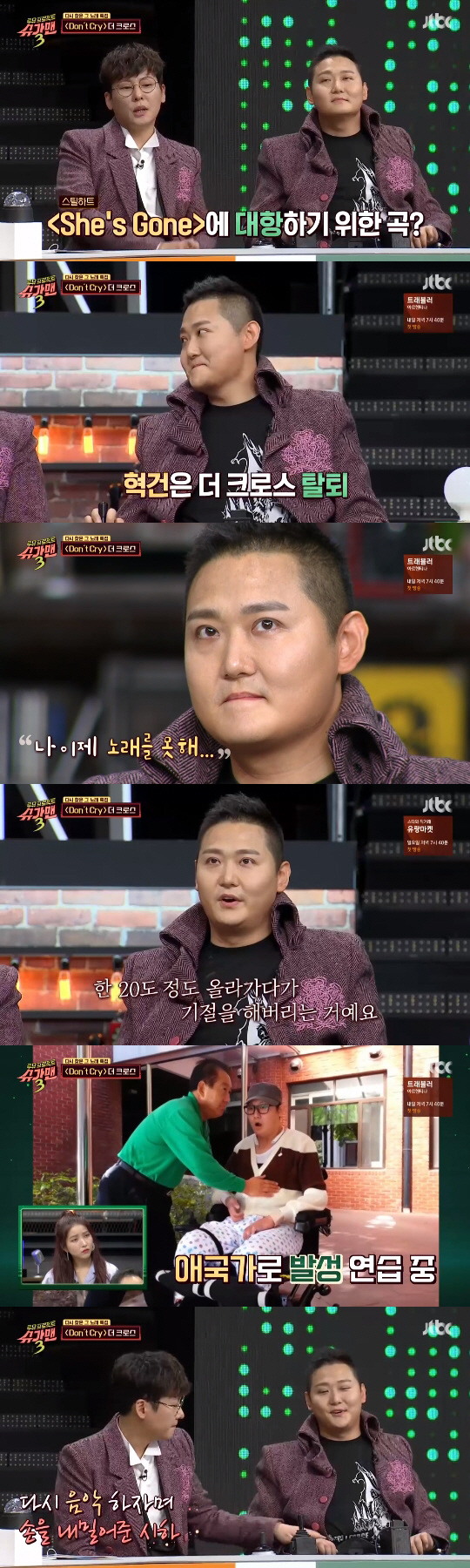 희열팀의 슈가맨으로는 2003년 발매된 초고음의 록 발라드곡 'Don't Cry'의 주인공 더 크로스가 등장했다. 휠체어를 타고 모습을 드러낸 멤버 김혁건은 이시하의 도움을 받아 17년 전 음정 그대로 고음을 소화했다.
