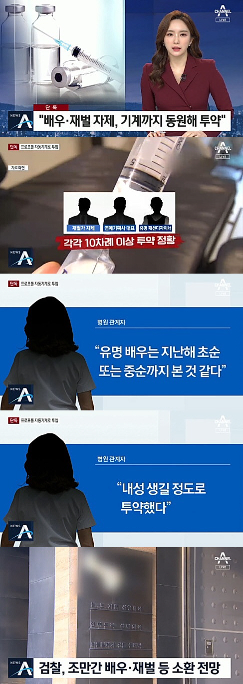 16일 채널A는 유명 배우 A씨를 포함해 재벌가 자제와 연예기획사 대표, 유명 패션디자이너 등이 프로포폴 불법 상습투약 의혹으로 검찰 수사선상에 올랐다며, 이들이 수 년 전부터 서울 강남구의 한 성형외과에서 각각 10차례 넘게 프로포폴을 불법 투약한 정황이 포착됐다고 보도했다. 앞서 채널A는 A씨가 친동생 이름으로 프로포폴을 여러 차례 투약한 정황이 포착됐다고 보도했다.