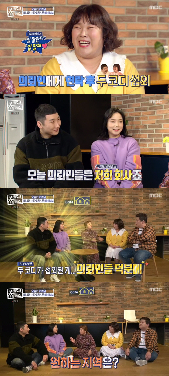 방 구하기에 앞서 박나래와 함께 의뢰인 커플을 만나러 간 유민상, 김민경은 의뢰인들을 보자마자 깜짝 놀라며 흥분을 감추지 못했다. 의뢰인들이 바로 자신들의 전매니저와 현스타일리스트였던 것. 두 사람은 "결혼 계획은 알고는 있었지만 '홈즈'에 의뢰할 줄은 꿈에도 몰랐다"며 놀라워했다.