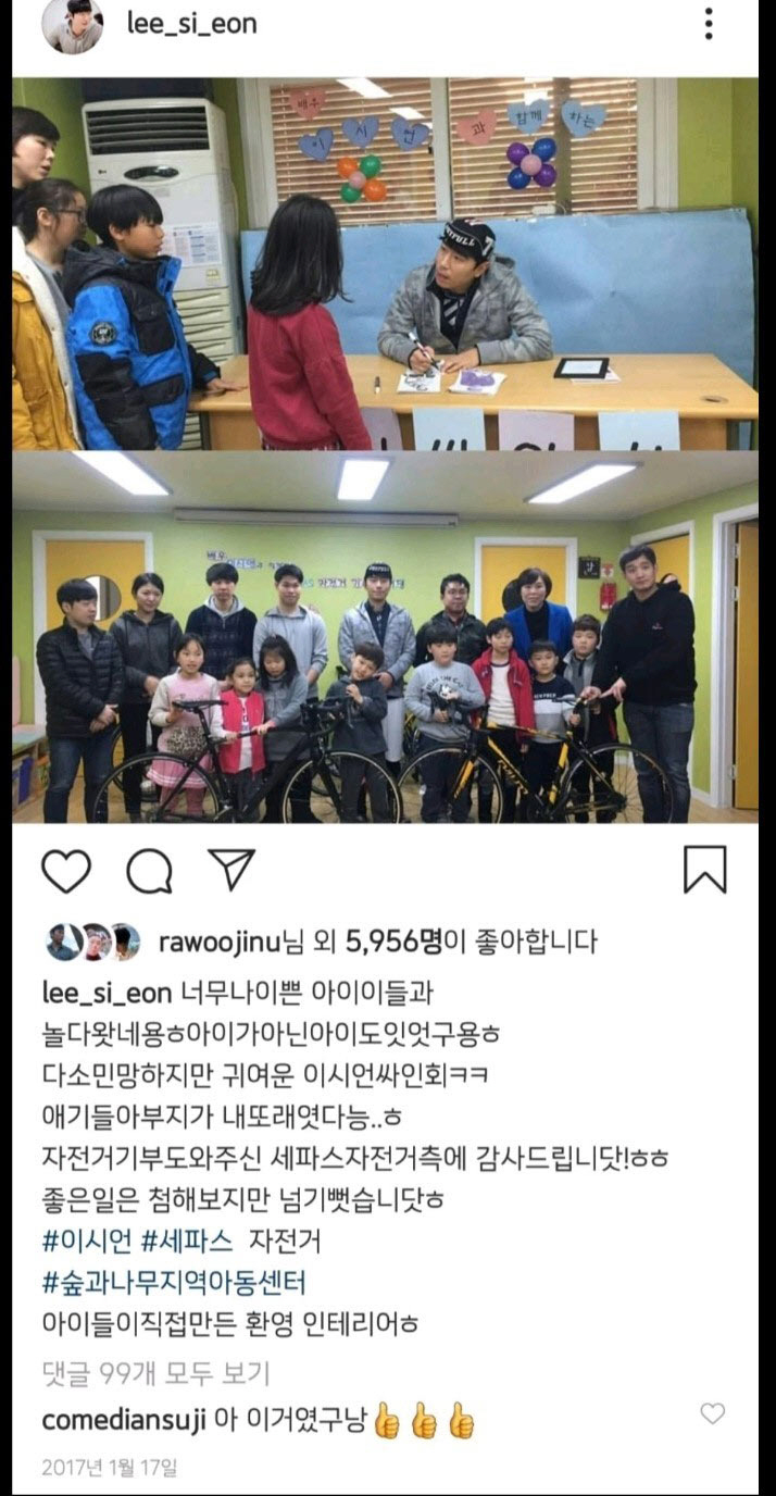 이어 같은 달 자전거 기부 프로젝트에 참가한 사실을 공개했다. 그는 "너무나 이쁜 아이들과 놀다 왔네요. 다소 민망하지만 귀여운 이시언 싸인회. 애기들 아부지가 내 또래였다는. 자전거 기부 도와주신 자전거회사측에 감사드립니다"며 현장 사진을 게재하기도 했다.