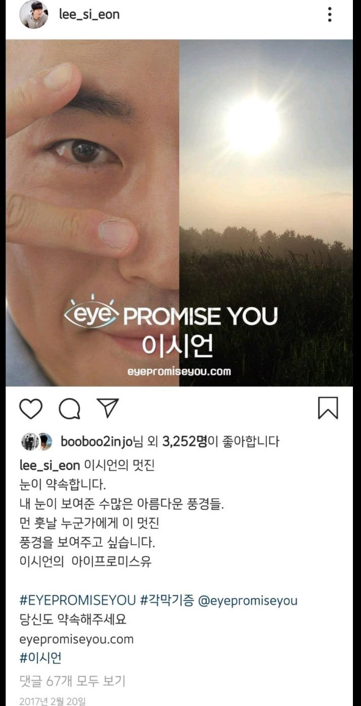 2017년 2월에는 각막 기증 프로젝트에 동참하는 뜻을 밝혔다. 그는 "이시언의 멋진 눈이 약속합니다. 내 눈이 보는 수많은 아름다운 풍경들. 먼 훗날 누군가에게 이 멋진 풍경을 보여주고 싶습니다. 이시언의 아이프로미스유"라는 주최사의 글을 적고 기증을 약속했다.