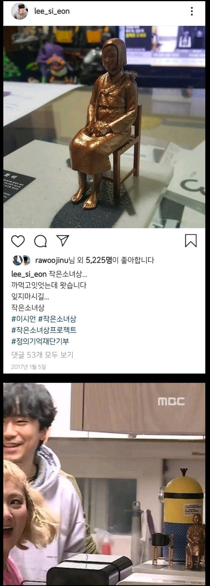 2017년 1월에는 "작은 소녀상, 까먹고 있었는데 왔습니다"라며 작은 소녀상 프로젝트에 참여한 사실을 전했다. 해당 소녀상은 '나혼자 산다'에서 이사한 이시언 집에서도 포착되며 눈길을 끌었다.