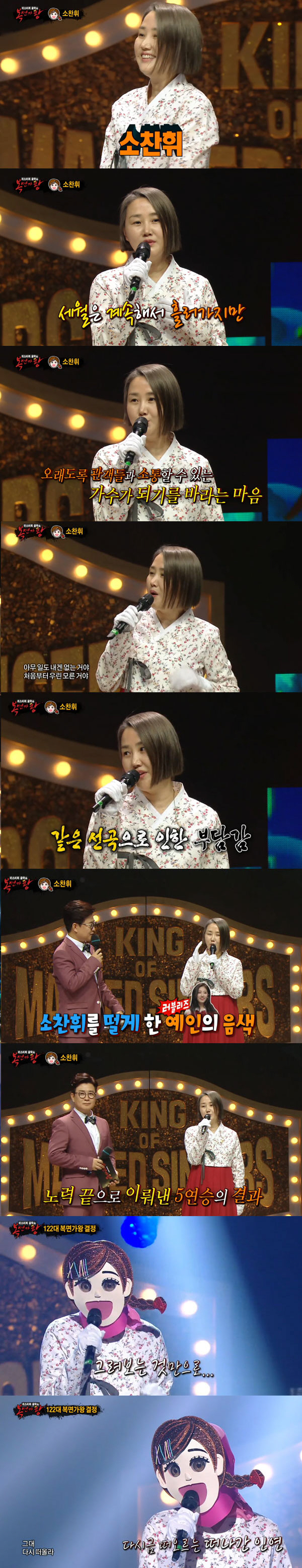 소찬휘는 "한 곡 한 곡 하면서 그때마다 새로운 도전이었다"며 "매 번 생각하던 것 이상으로 들여드릴 수 있을까 문제점이었는데, 한 무대씩 하다보니까 5연승을 하게 됐다. 너무 감사하다"고 소감을 전했다.