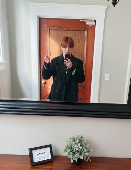 공개된 사진에는 거울을 보며 브이 포즈를 하고 있는 강다니엘의 모습이 담겼다.