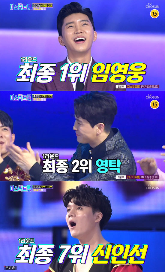 1라운드 마스터 점수 순위가 공개됐다. 임영웅, 영탁, 장민호가 상위권에 올랐다. 이후 정동원, 이찬원, 김호중, 김경민, 류지광, 나태주, 김희재, 강태관, 황윤성 순이다.