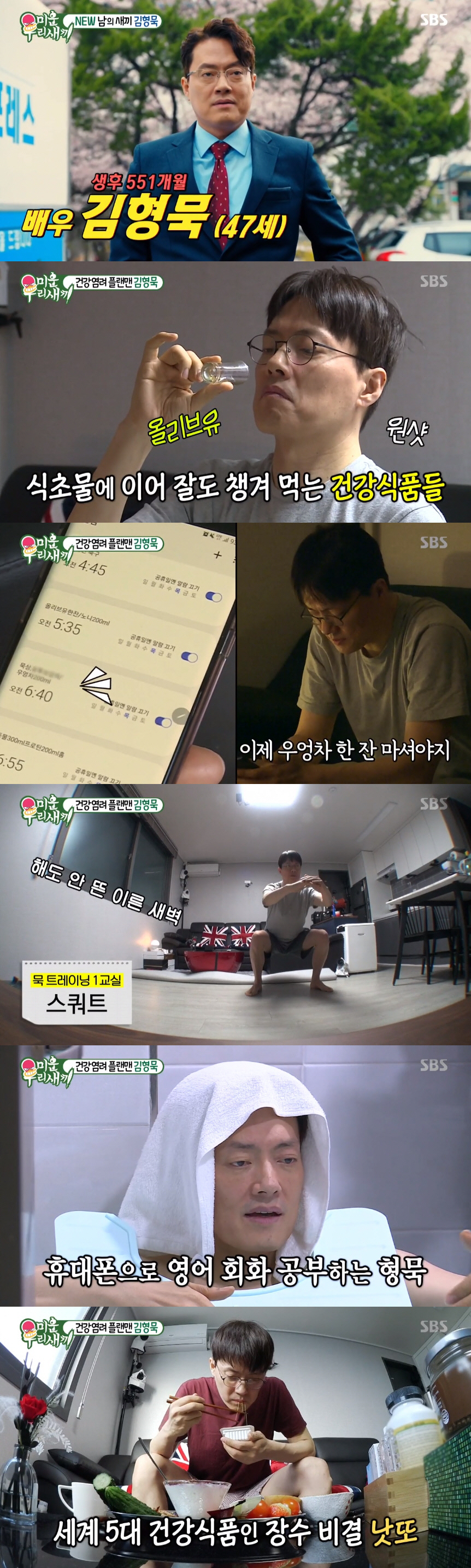 이어 손흥민이 출전하는 축구 경기를 시청하던 그는 1시간 30분 후 알람이 울리자 다시 부엌으로 향해 올리브유와 노니 주스를 마셨다. 또다시 1시간 뒤 알람이 울렸고, 이번에는 우엉차 티타임을 가졌다. 김형묵은 휴대폰 알람을 꽉 채운 자신만의 건강 플랜을 지키는 철저한 '플랜맨' 생활으로 놀라움을 안겼다.