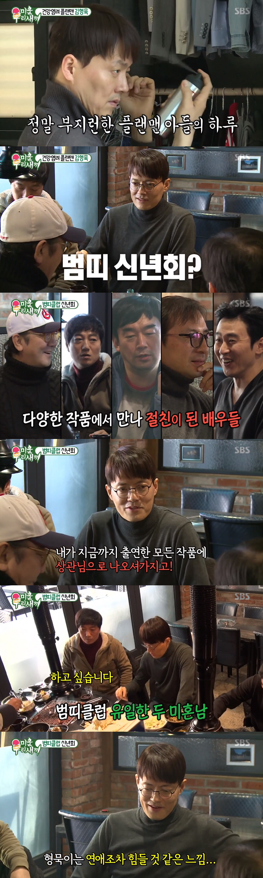 아침 식사를 마친 김형묵은 피아노 앞에 앉아 발성 연습을 했다. 이후 집안 청소와 피부 관리, 빨래까지 모두 끝낸 그는 외출에 나섰다. 절친한 배우들과 만난 김형묵은 이날 생일의 주인공인 배우 김홍파와의 남다른 인연을 공개했다. 그는 "신기한 게 홍파 형님과 보통 인연이 아닌 것 같다. 내가 지금까지 출연한 모든 작품에 상관님으로 나오셨다"고 말해 놀라움을 안겼다.