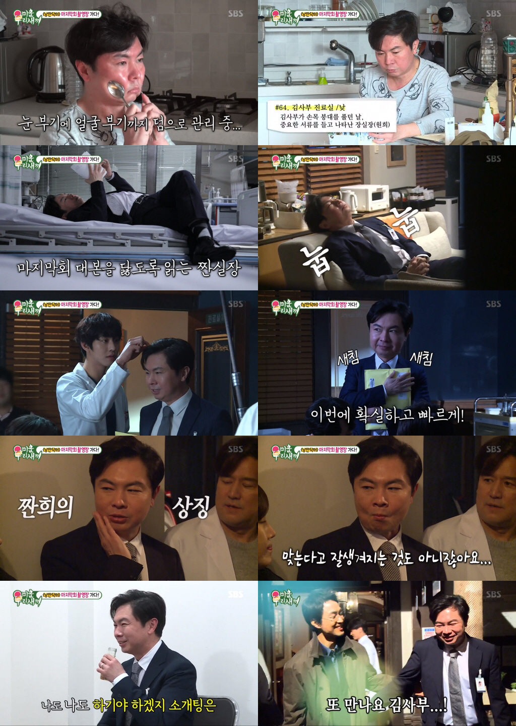 촬영장에 등장해 멋진 슈트 차림으로 시선을 사로잡은 임원희는 마지막 회 대본을 닳도록 읽으며 연기 준비를 하는 천상 배우의 모습으로 매력을 뽐냈다. 하지만 긴 대기 시간에 지친 듯 소파에서의 눕방과 함께 숙면에 들어가 감출 수 없는 짠내를 폭발시켰다.