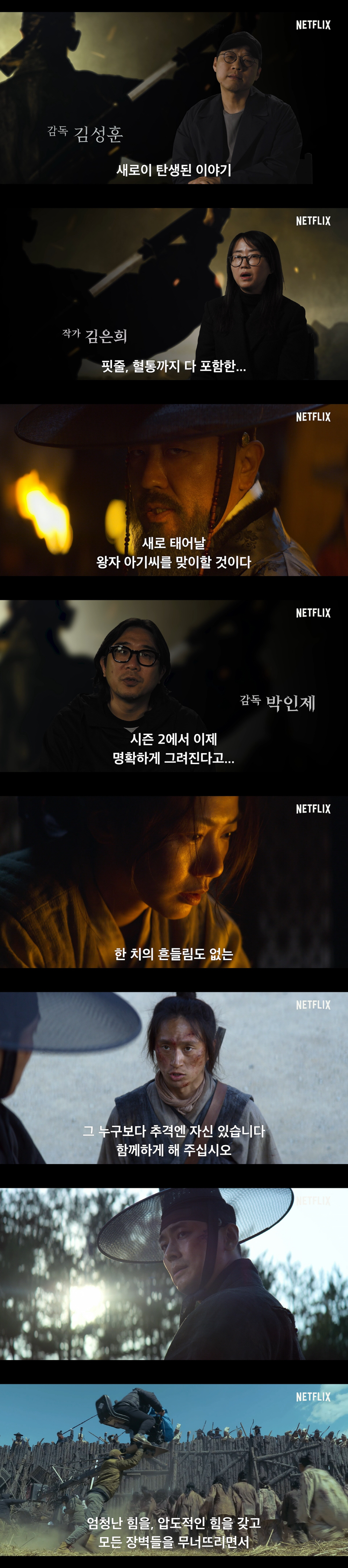 또한 충격적인 엔딩씬으로 시즌1을 끝맺었던 김성훈 감독은 "예상치 못한 상황에서 쓰나미처럼 밀려오는" 생사역과의 거대한 액션으로 시즌 2를 시작하며 다시 한번 눈을 뗄 수 없는 장면을 선사한다. 시즌 2의 포문을 여는 운포늪 전투와 한양의 궁을 배경으로 펼쳐지는 압도적인 피의 전투씬은 스펙터클한 볼거리와 함께 환란에 맞서 모든 것을 건 창의 의지를 보여준다. 2화부터 6화를 연출하며 새롭게 합류한 박인제 감독은 "진정한 왕, 백성을 위한 왕으로 성장해가는 과정"이 명확하게 드러난다는 말로 김성훈 감독에 이어 박감독이 보여줄 시즌2에 대해서 설명했다. 시즌1의 주요 배우진과 베테랑 제작진, 거기에 박인제 감독까지 합류해 더 깊고 커진 이야기와 스펙터클로 돌아올 <킹덤> 시즌2에 대한 기대감이 점점 더 고조되고 있다.