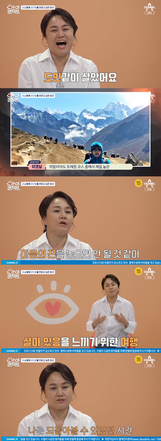 이어 모습을 드러낸 이경실은 그간의 근황을 묻는 질문에 "도인 같이 살았다. 친구들하고 등산을 많이 다녔는데, 히말라야도 트레킹 코스 중에 제일 높은 곳으로 갔다. 마음의 끈을 놓으면 병에 걸릴것 같아서 살아있는걸 느끼기 위해 여행을 다녔다"고 답했다.