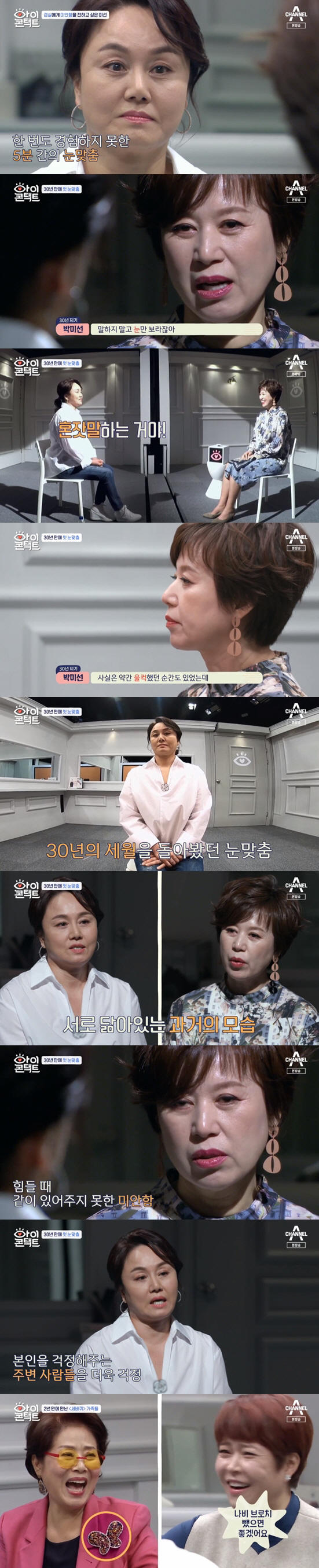 30년의 세월을 돌아봤던 눈맞춤을 한 두사람은 이후 서로를 향한 진심을 털어놨다. 박미선은 "난 언니의 고운 모습을 안다. 우리의 삶이 사실 평탄하지만은 않았다. 정말 열심히 살았다"고 과거를 떠올렸고, 이경실 역시 "너를 보면 또 다른 나를 보는 것 같았다. 언제부턴가는 동반지같은 느낌이 들었다. 네가 대견하다고 생각했다"고 전했다.