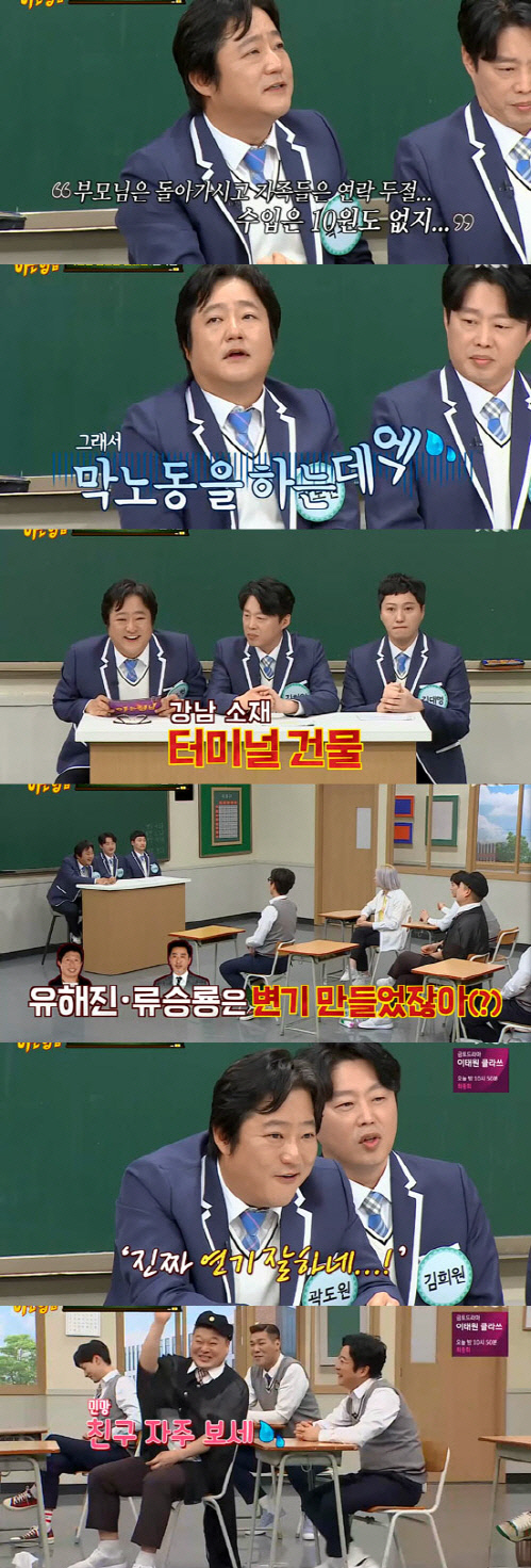 곽도원은 "부모님은 돌아가시고 가족들은 연락두절, 수입은 10원도 없지. 연극 배우 시절에 정말 너무 힘들었다. IMF까지 와서 더 힘들었다. 막노동을 하는데 엄청난 건물을 짓는데 투입됐다. 6개월 동안 철근을 깔았다. 그런데 나중에 제가 그 건물에 무대 인사를 하러 가게됐다. 무대에서 '제가 여기 건물 철근 작업을 했었다. 정말 튼튼하게 했다. 안전하고 편안한 영화 관람 되십시요'라고 인사했는데 관객들이 박수를 쳐주셨다"고 말했다. 김희원은 "유해진 류승용도 변기 만들었다. 비데 회사 다녔다"고 덧붙였다. 이에 김희철은 "저도 TV를 보면 남다르다. 고 3때 공장다니면서 TV만들었다"고 말했다.