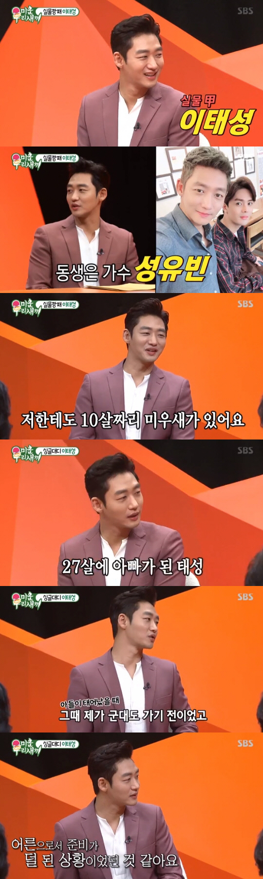 또 이태성은 "아들이 아빠가 배우라는 사실을 알고 있다"며 "같이 TV를 보기도 한다. 드라마에서 맞는 장면이 있거나 사고가 나면 몰입해서 울려고 한다"고 말했다. 그는 "학교 가서도 자랑도 하고, 식당 같은 곳에서 누가 나를 알아보면 내 이름을 부른다. '아빠'라고 안 하고, '이태성 아빠'라고 부르더라"고 밝혀 폭소케 했다.
