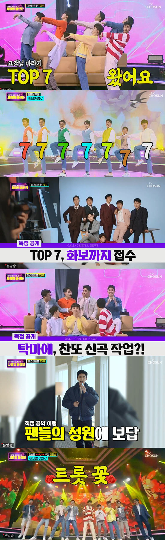 MC 김성주와 붐은 "오늘 콘셉트는 안방에서 하는 봄소풍 느낌"이라며 "TOP7이 화보 촬영을 했다. 또 영탁이 이찬원을 위한 노래를 만들고 있다. 마지막으로 임영웅이 조영수 작곡가의 노래 녹음을 완료했다"고 새로운 소식부터 알렸다.