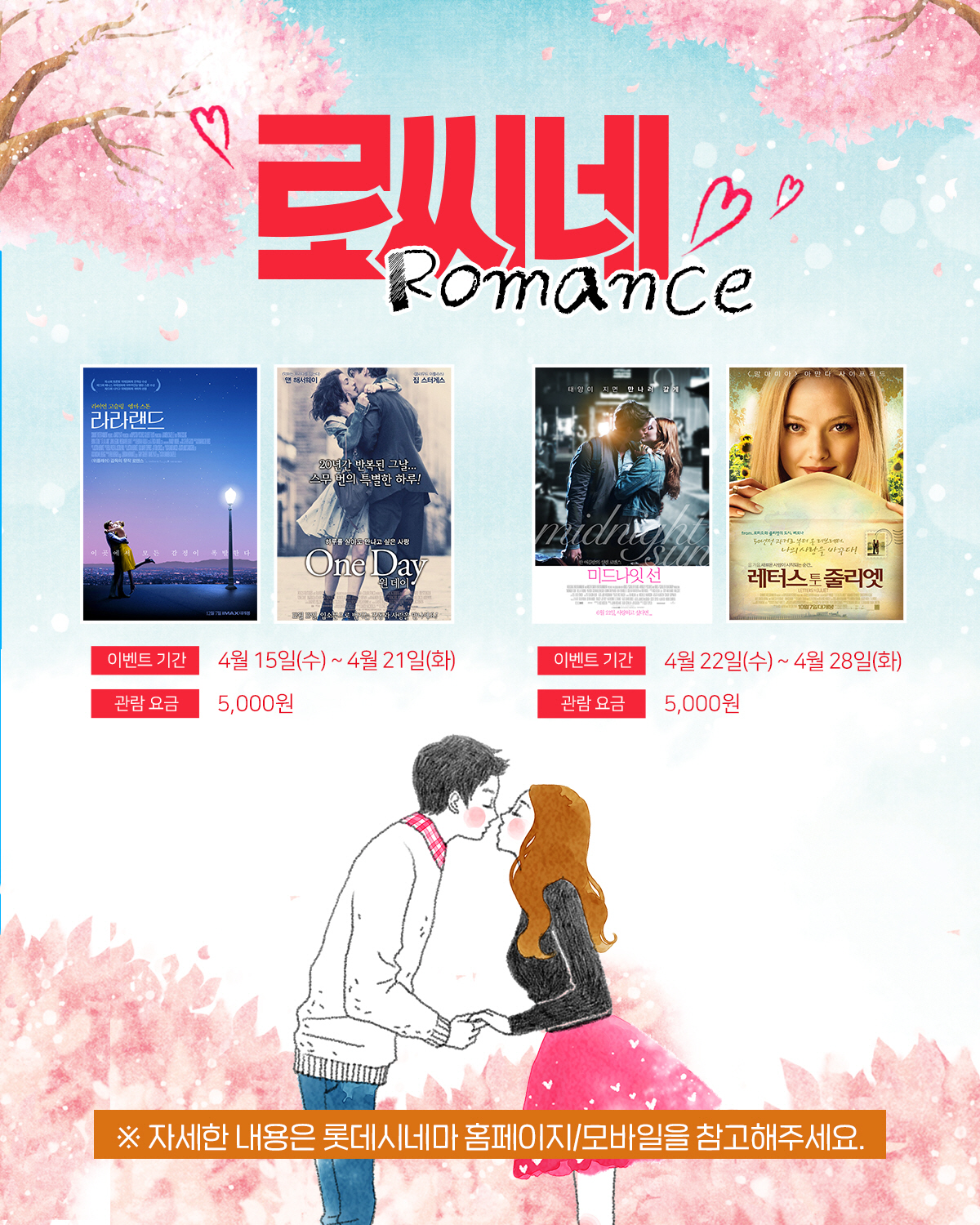 롯데시네마의 '로씨네 로맨스' 기획전은 월드타워관을 포함한 전국 80여개 영화관에서 만나볼 수 있으며, 전 작품 5000원에 관람할 수 있다.