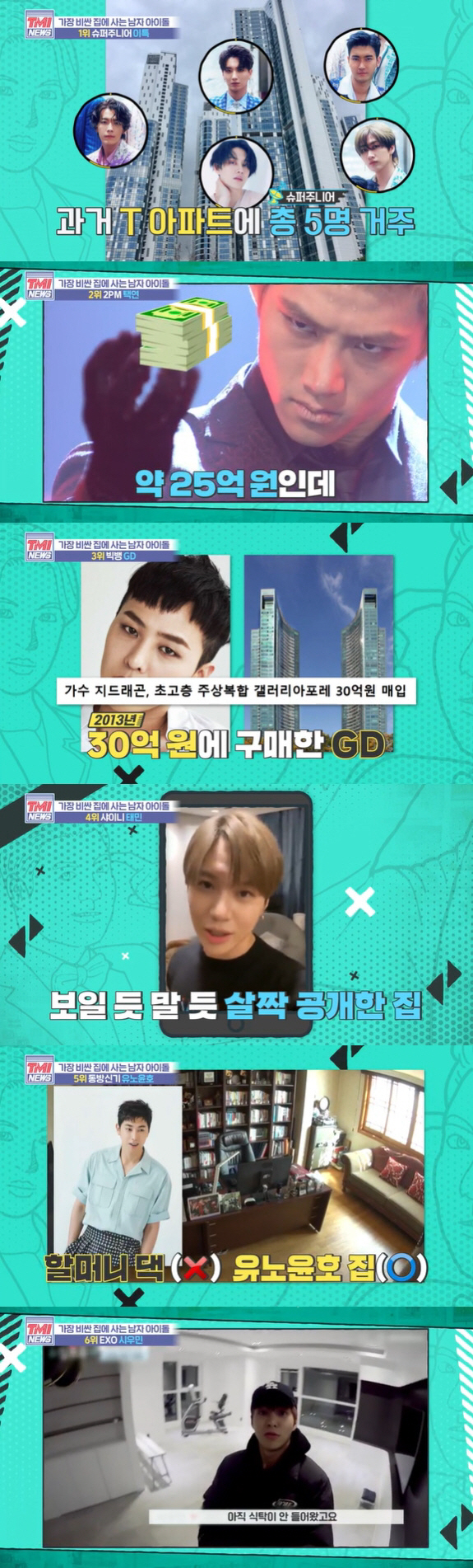 6위는 엑소 시우민이었다. 지난해 숙소에서 독립한 시우민은 광진구에 위치한 T 아파트를 구입, 현재 매매가는 약 19억 원인 것으로 확인됐다.