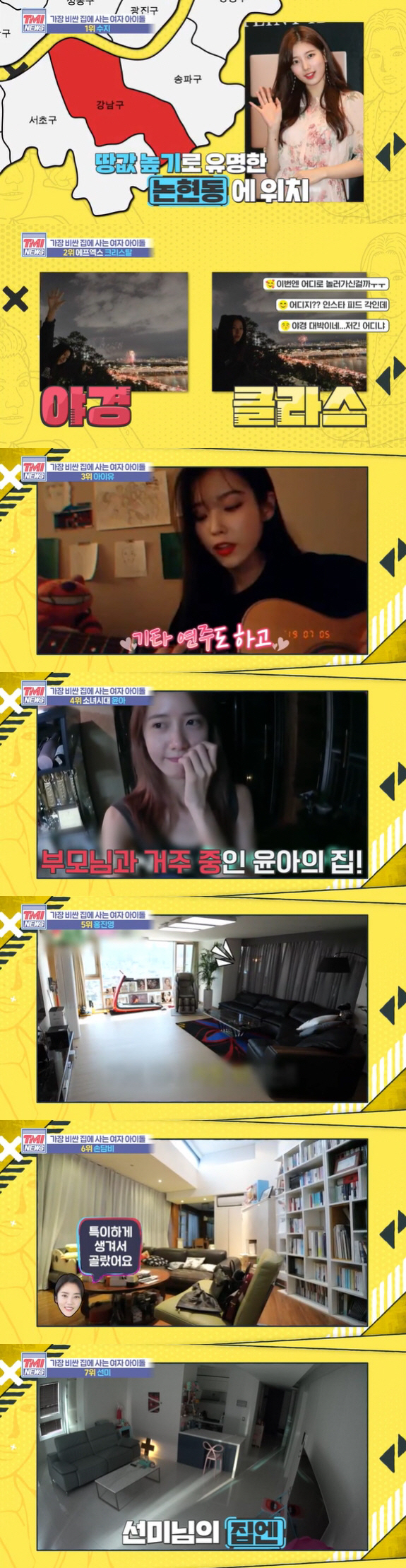 이어 '가장 비싼 집에 사는 여자 아이돌 BEST 7'도 공개됐다. 1위는 유럽 분위기가 물씬 풍기는 논현동 N 아파트(타운하우스)에 거주 중인 수지였다. 혼자 사는 것으로 알려진 수지의 집의 공급 면적은 무려 134평. 현재 매매가는 약 40억 원인 것으로 전해졌다.