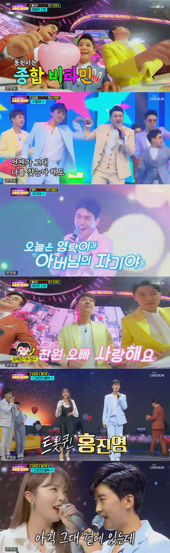 한편 이날 신청자 전원에게 선물을 드릴 수 있는 '100점 도전 이벤트'가 펼쳐졌다. 이에 TOP7은 '천생연분'으로 7가지 색깔의 사랑 고백을 했지만 아쉽게도 95점을 받아 실패했다. 이에 홍진영은 '오라버니'로 다시 한 번 도전했고 100점을 해냈다.