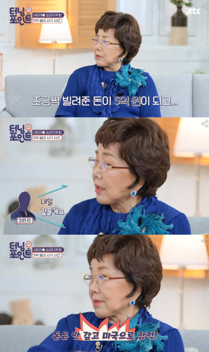 이어 "불안한 마음에 이자도 마다하며 원금을 돌려받으려고 했다. 돈을 빌려준 사람한테 가서 돈을 달라고 했더니 내일 주겠다고 하더라. 그래서 믿었다. 그런데 돈을 꿔간 사람이 새벽에 미국으로 잠적해버리고 말았다. 그때 큰 충격을 받고 쓰러졌다. 일주일동안 급성 척추 협착증으로 누워있었다. 그러다 이러면 안 되겠다 싶어 마음을 다 잡고 스스로 일어났다"고 밝혀 안타까움을 안겼다.