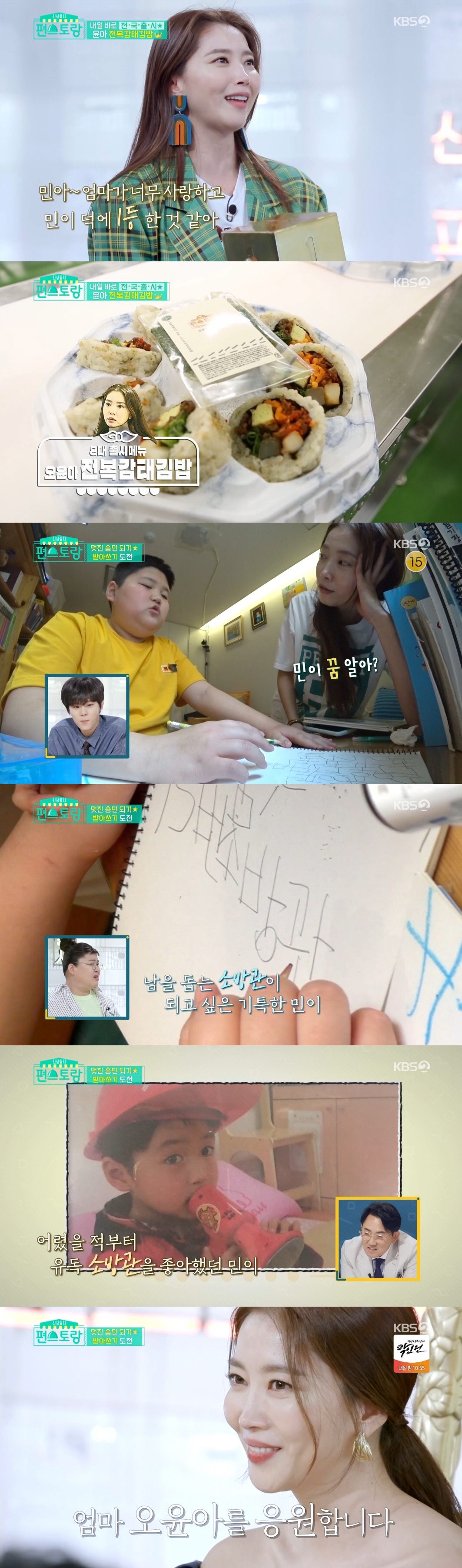 이후 오윤아는 민이와 '꿈'에 대해 이야기했다. '꿈'이 무엇인지 묻는 오윤아에게, 민이는 "소방관"이라고 답하며 글자로 썼다. 남을 돕는 일을 꿈으로 삼은 민이에 '편스토랑' 스튜디오는 감동으로 물들었다. 해당 장면은 분당 시청률 7.4%까지 치솟으며 이날 방송의 '최고의 1분'을 차지했다.