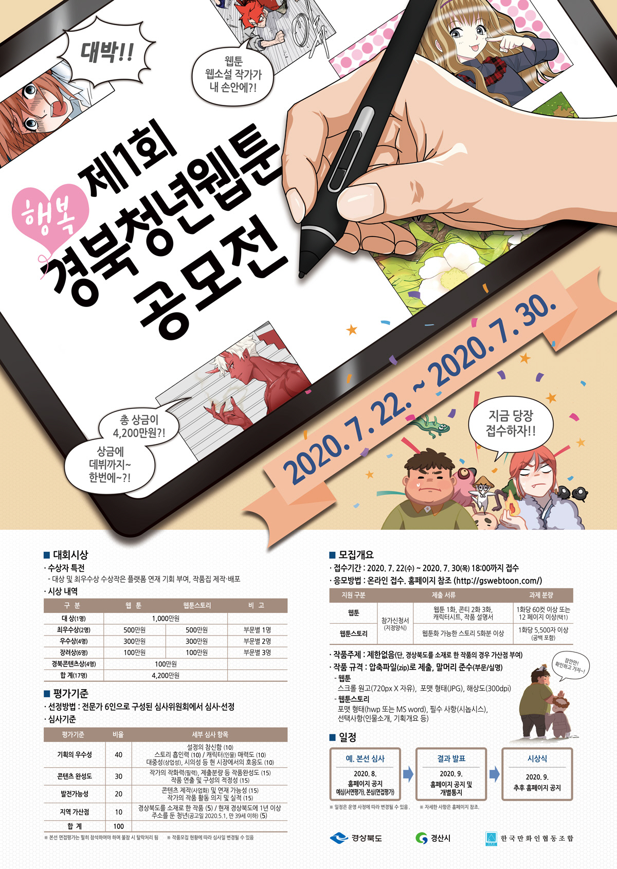 공모기간은 오는 7월 22일(수)부터 7월 30일(목)까지이며, 응모는 행복경북 청년웹툰 공모전 홈페이지에서 하면 된다.
