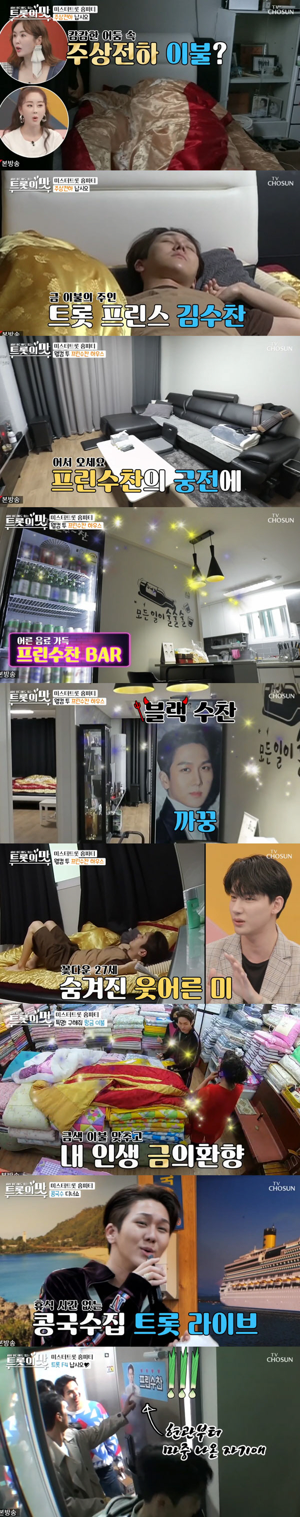 이날 '미스터트롯' 최강 흥부자인 김수찬은 '트롯 프린스'라는 수식어에 걸맞게 황금빛 이불 속에서 자태를 드러냈다. 찜질방 의상부터 안마봉까지 꽃다운 27세에 숨겨진 웃어른 미는 웃음을 안겼다. 현관부터 시작해 집안 곳곳에 자신의 사진들로 도배를 해 놓은 '수찬이네 특급 혼자 하우스'. 여기에 냉장고에 술이 가득찬 '프린수찬 BAR' 또한 눈길을 끌었다.