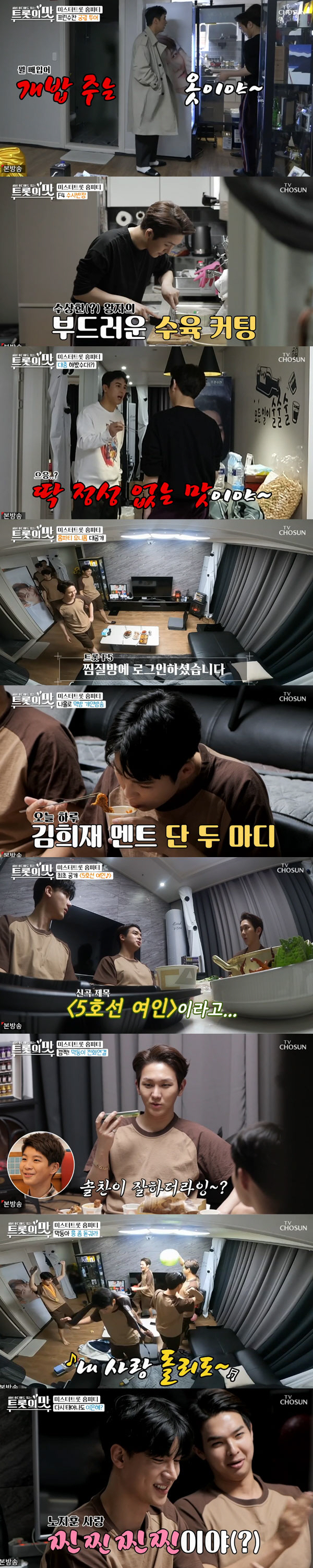 28일 방송된 TV CHOSUN '아내의 맛'에서는 '미스터트롯'에서 맛깔나는 트롯은 물론 다재다능한 끼를 아낌없이 방출했던 김수찬이 장민호-김희재-노지훈-류지광을 집으로 초대했다.