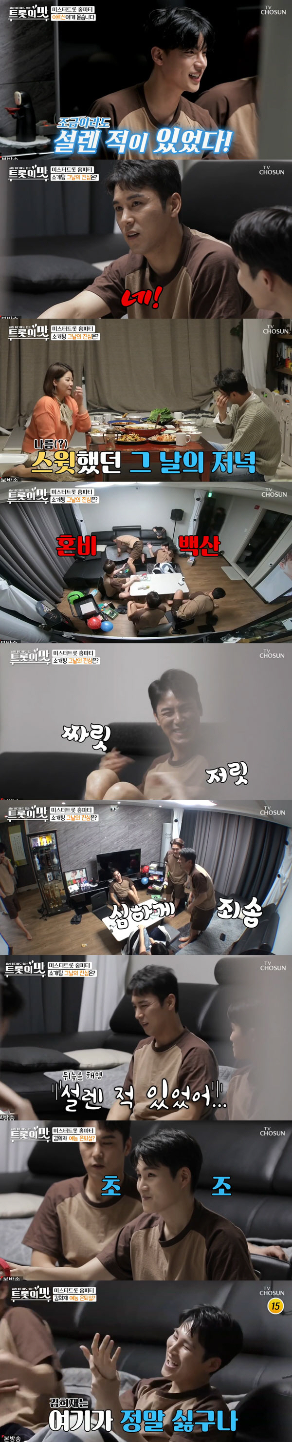 장민호는 이어진 노지훈의 공격에 긴장했다. 노지훈은 "얼마 전 우리 집에서 누나와 식사 자리를 했는데 조금이라도 설렌 적이 있었다"며 단도직입 돌직구 질문을 건넸다. 장민호는 "조금이라도?"라고 물은 뒤 "네"라고 했지만, 이내 갑작스러운 전기 공격에 혼비백산해 웃음을 안겼다. 노지훈은 자리를 떴고, 장민호는 "죄송합니다"라고 사과해 웃음을 안겼다. 이처럼 트롯맨 5인방의 웃음과 흥삘로 가득한 '역대급 홈파티'는 대성공이었다.