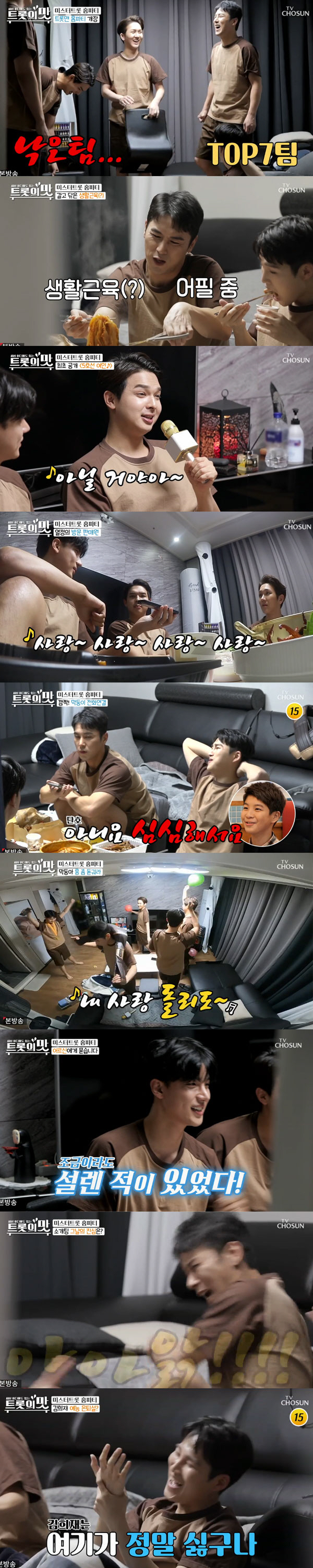 댄스로 흥을 이끌어낸 뒤, 거짓말 탐지기 게임을 시작했다. 김희재는 노지훈에게 "나는 다시 태어나도 지금의 아내와 결혼하고 싶다"고 물었고, 노지훈은 고민없이 "네"라고 답했다. 결과는 '진실'이었다. 이어 노지훈은 장민호에게 "얼마 전 우리 집에서 누나와 식사 자리를 하는데 설렌 적이 있었다"고 물었다. 장민호는 "네"라고 답했지만, 속마음은 '거짓'이었다. 결국 장민호는 "죄송합니다"라고 사과해 웃음을 안겼다.