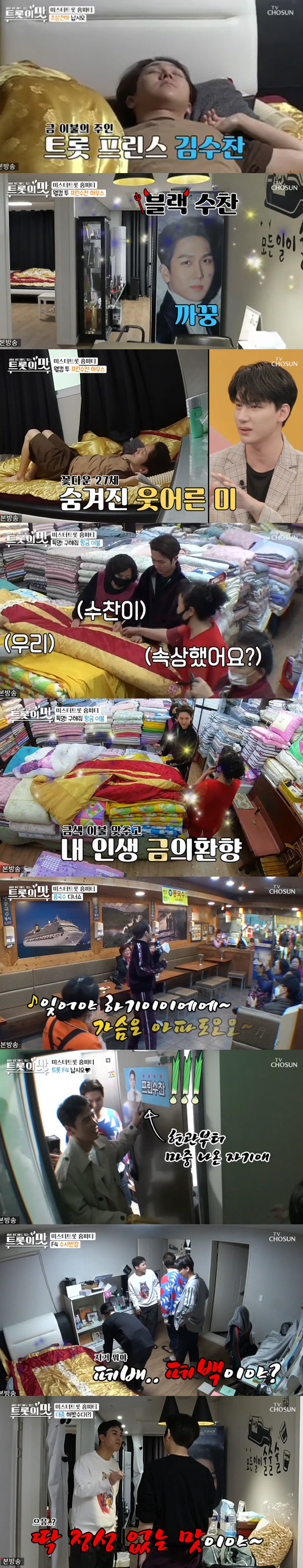 그때 뜯어진 이불을 발견한 김수찬은 황금 이불을 맞춘 가게로 향했다. 김수찬은 "이불을 금색으로 맞춰서 그런지 금의환향했다"고 했고, 사장님은 "너무 좋다"며 웃었다. 30분 걸린다는 말에 김수찬은 단골 식당으로 향했고, 그곳에서 미니 콘서트를 펼쳤다.