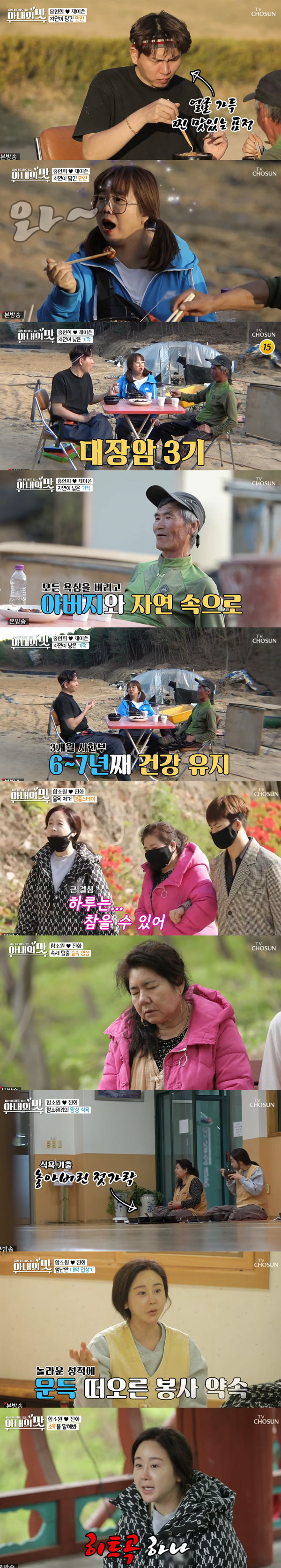 자연인은 "대장암3기 수술을 했다. 3개월 밖에 못 산다고 해서 '나가서 나 혼자 죽는다'고 퇴원해서 여기 와서 아버지 옆에서 지낸다"고 했다. 그는 "6~7년 됐다. 지금은 완치됐다. 어죽으로 암 치료 한거다"면서 아버지를 떠올린 뒤, "아버지한테 잘 해드려라"고 말해 뭉클함을 안겼다.