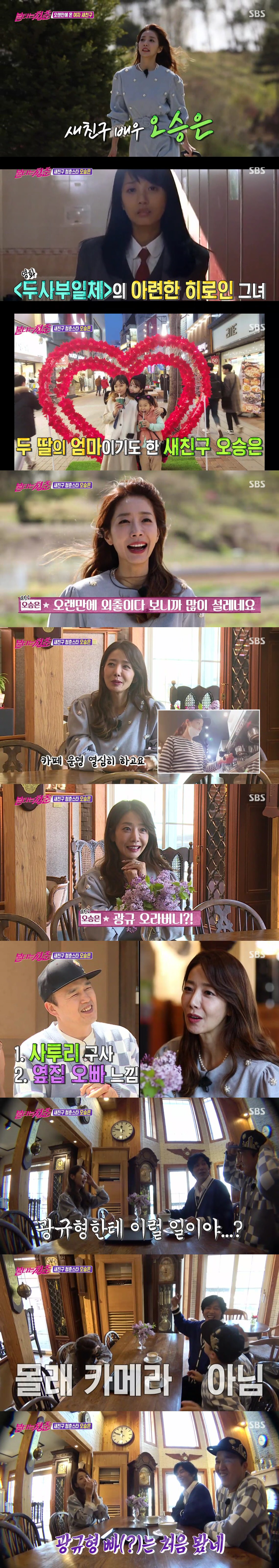 이에 제작진은 "오빠야 빨리 온나 보고싶다~"라는 승은의 애교섞인 목소리를 녹음해 새 친구 힌트로 안겨줬고 김광규와 최성국이 마중을 나왔다. 근처 카페에서 새 친구를 만난 최성국은 오승은을 보자 과거 같은 소속사였다며 "예전보다 훨씬 마르고 그래서 못 알아봤다"라고 말했다. 이어 광규는 "두사부일체 너무 잘 봤다 아이가"라며 오승은에게 걸쭉한 경상도 사투리로 덕담을 건네 훈훈함을 자아냈다.