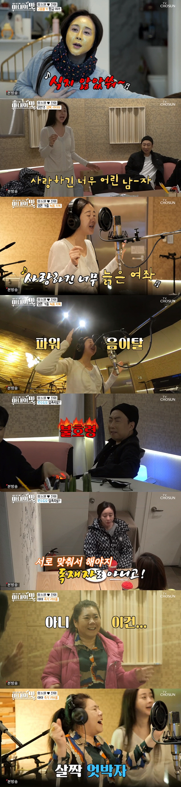 하지만 이런 의지도 잠시, 함소원은 박명수가 준비한 곡의 가사에 대해 불만을 표하며 첫 톤 조율에서도 의견 차이를 드러냈다. 박명수가 제안한 곡 속 가사에는 '늙은 여자' '주책 바가지' 등의 표현이 담겨있었고 이에 함소원이 강하게 반발하고 나선 것. 박명수는 "이럴거면 곡을 받지 말아라"며 "너를 생각하고 쓴 가사다. 그래야 시청자의 공감도도 높다. 작곡가 유재환이 마술사다. 우리만 믿고 따라오면 된다"고 자신감을 드러냈다.