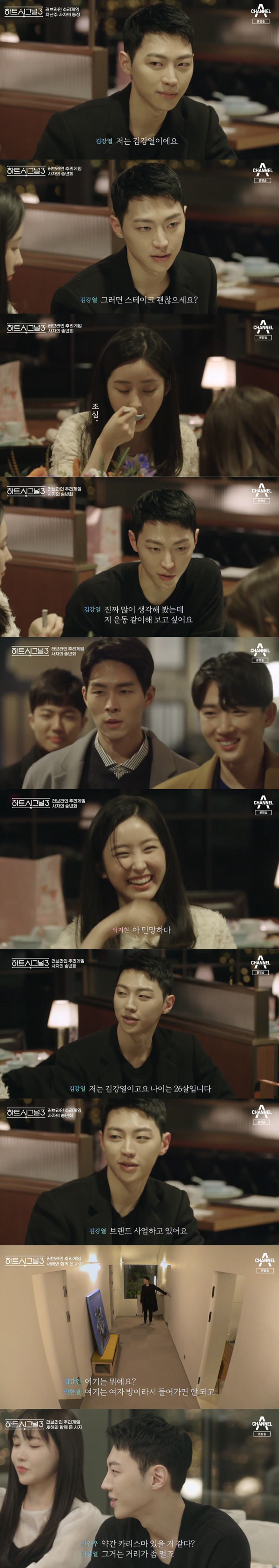 6일 방송된 채널A '하트시그널3'에는 새로운 입주자 '사자' 김강열이 등장으로 기존 남자 입주자들 사이에서 긴장감이 감돌기 시작했다. 김강열은 박지현, 서민재, 이가흔과 어색함 속 저녁식사를 했고, 주도적으로 식사를 주문하고 아스파라거스를 자르는 등 세심한 배려를 해주며 점수를 땄다.