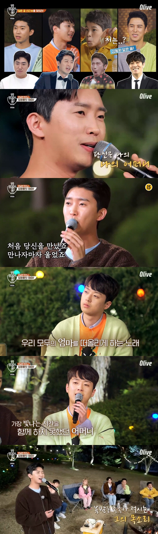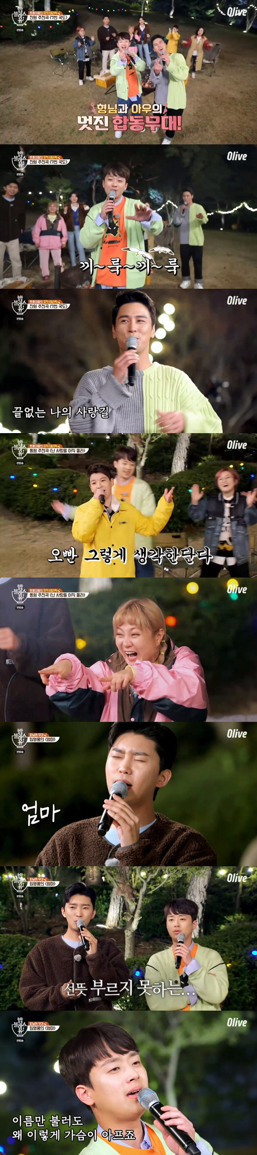 임영웅은 "야영 갔을 때 촛불 들고 부모님 생각하며 울던 게 떠올랐다"며 발라드 곡인 라디의 '엄마'를 선곡, 뭉클함을 안겼다. 노래를 가만히 듣고 있던 이찬원은 눈물을 보였다. 코로나19 등의 상황으로 인해 이찬원은 어머니를 6개월째 보지 못하고 있다고. 이찬원은 감정을 추스르고 함께 '엄마'를 불러 감동을 안겼다.