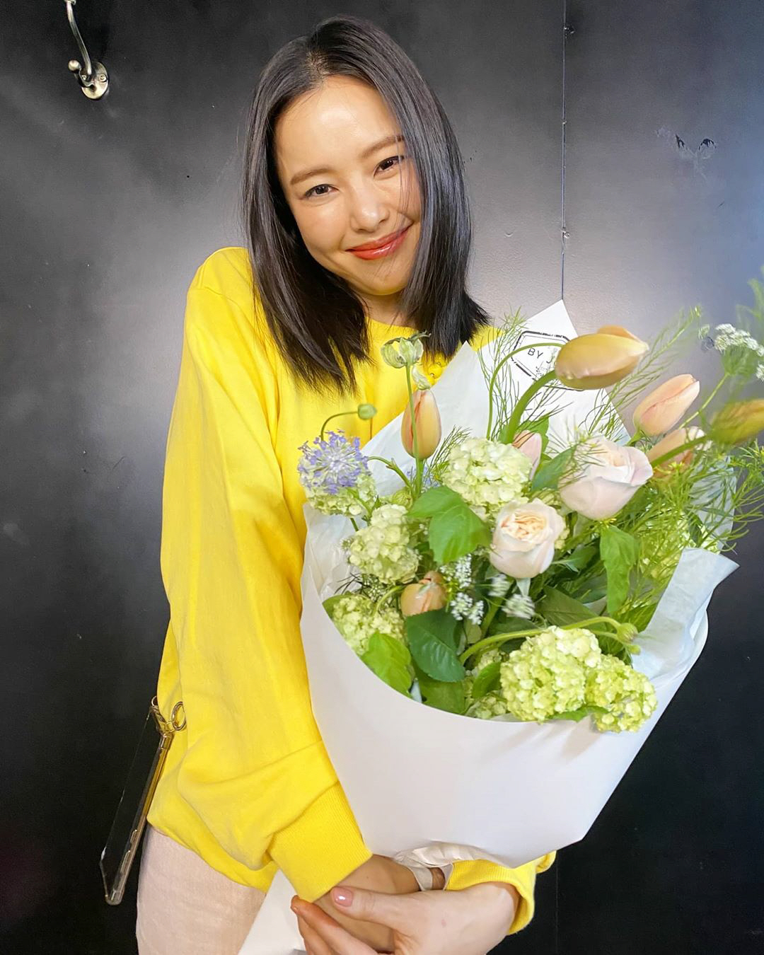 사진에는 노란색 옷을 입고 화사한 미모를 뽐내는 이하늬의 모습이 담겨 있다. 꽃다발을 들고 특유의 보조개 미소를 짓는 이하늬의 사랑스러운 매력이 시선을 사로잡는다.