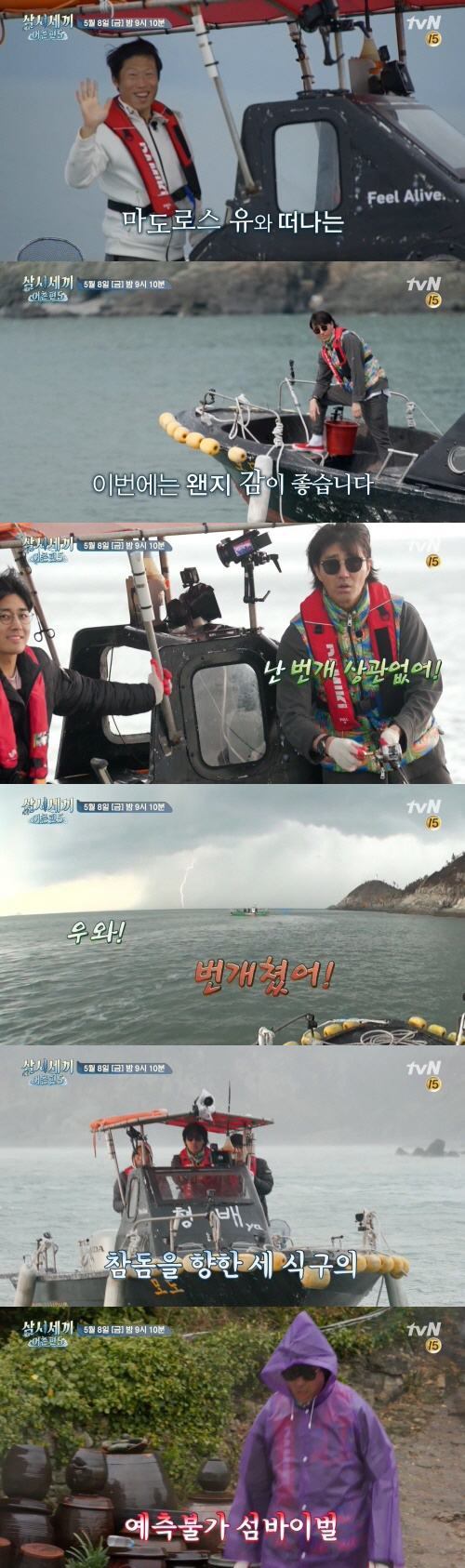 배 면허를 취득한 '마도로스 유' 유해진과 함께하는 참돔잡이 낚시 투어도 이어진다. 방송을 앞두고 공개된 예고편에서는 유독 돔과 인연이 없는 유해진답게 낚시 투어 도중 갑작스레 번개가 내리치고, 비가 쏟아지며 험난한 앞길을 예고한다. 과연 세 식구가 전설 속의 생선으로 불리는 참돔잡이에 성공할 수 있을지는 이날 방송에서 확인할 수 있다.