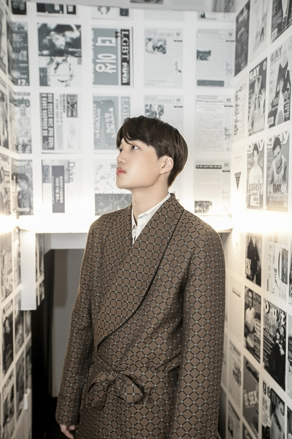 전시장을 방문한 카이의 의상은 모두 구찌 2020 프리폴 컬렉션으로, GG 네트 디테일이 돋보이는 브라운-블랙 컬러의 코트에 아이보리-블루 컬러의 빈티지 스트라이프 박시 셔츠로 포인트를 줬다.