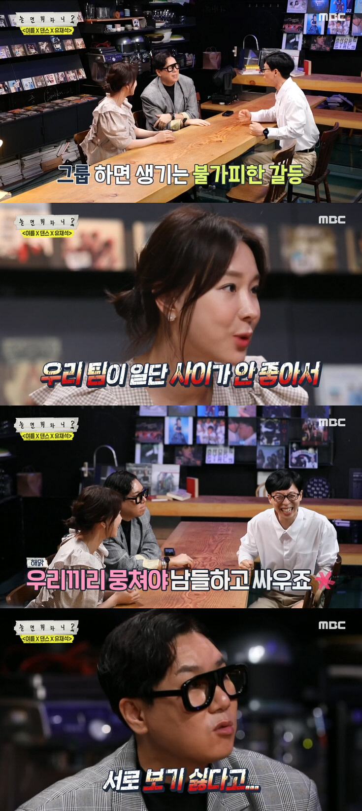 이날 유재석은 "그룹 활동을 하면 작은 다툼도 있을 것 같다"며 조심스럽게 그룹 내 불화에 대해 질문을 했다. 이를 듣던 이지혜는 화들짝 놀라며 "저는 잠깐 나갔다 오겠다. 제가 뭘 어떻게 얘기를 하겠나"며 당황했다.