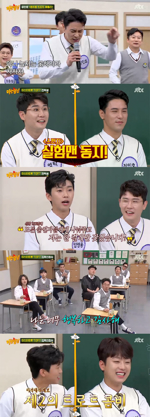 임영웅과 이찬원은 "티격태격하면서 기분 나빠 하지말고 리액션 잘해주자고 약속했다"라며 남다른 예능 콤비를 보였다. 이에 이수근은 "송대관과 태진아를 잇는 콤비로 거듭날 것 같다"라며 친형제 같은 두 사람의 모습에 웃음을 터트렸다. 그러면서 "방송 3사 예능대상을 타고 싶다"는 이찬원은 하고 싶은 예능 1순위로 '아는형님'을 꼽으며 "내가 이 중에 한 두명 보다는 잘 할 수 있다"고 말해 웃음을 안겼다.