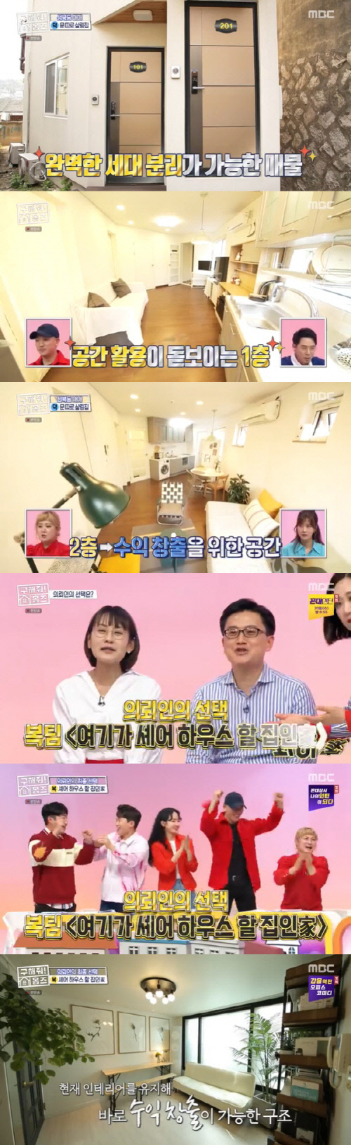 이에 복팀에서는 팀장 박나래와 인턴 코디 개코, 핫펠트가 나섰다. 첫 번째 매물 1호 '1,2(일리) 있는 집'은 서울 종로구 홍지동에 위치했다. 이 집은 1층과 2층의 완벽한 공간 분리와 수요 많은 입지 조건, 2개의 넓은 베란다를 갖추고 있어 눈길을 사로잡았다. 이를 본 양세형은 "셰어하우스를 위해 만든 집 같다"며 감탄했다. 가격도 3억 9천 7백만 원으로 의뢰인의 예산이 절약됐다. 그러나 좁은 1층 거실과 2층에는 간이 주방이 없다는 점이 아쉬움을 남겼다.